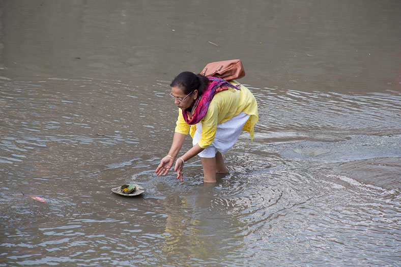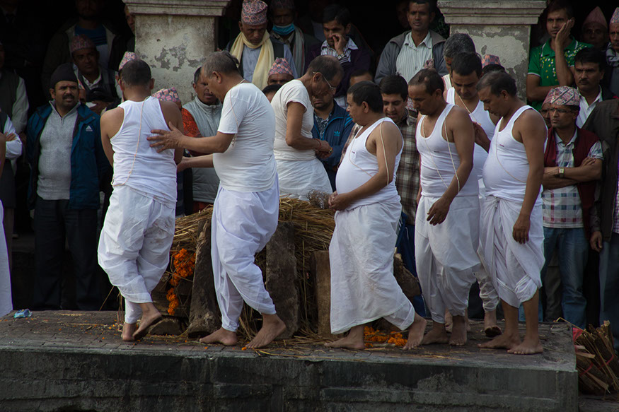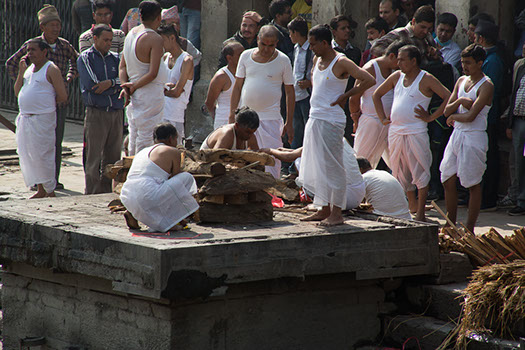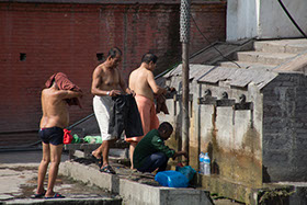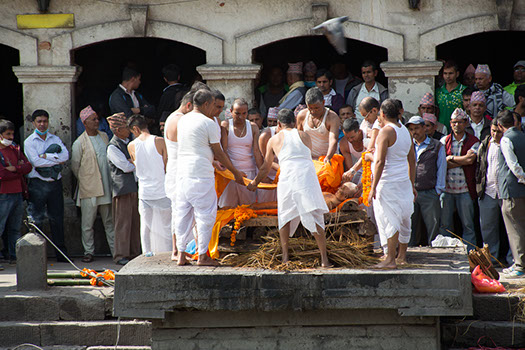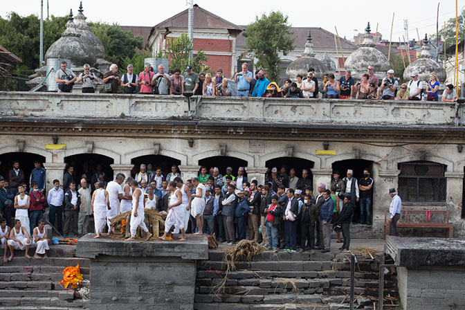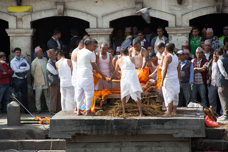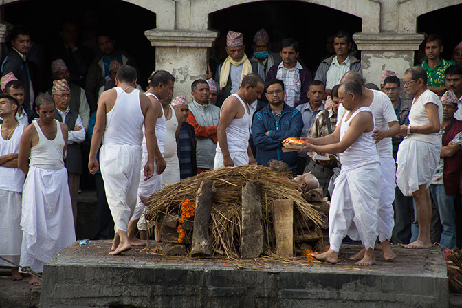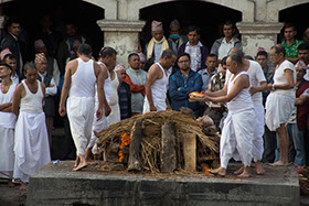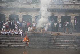 According to the Nepalese Hindu tradition, the dead body must be dipped three times into the Bagmati River before cremation, so that the reincarnation cycle may be ended. The chief mourner (usually the first son) who lights the funeral pyre must take a holy river-water bath immediately after cremation. Many relatives who join the funeral procession also take a bath in the Bagmati River or sprinkle the holy water on their bodies at the end of cremation. The Bagmati River purifies the people spiritually. The last slide is of an offering made in return for a blessing. These procedures are no longer carried out in full as you will see from these images.